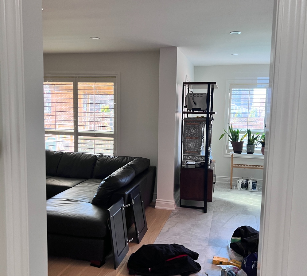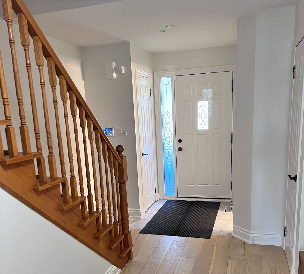 Our team upgraded this Oakville home with a full kitchen, powder room and staircase renovation, giving the entire main floor a fresh, modern look. In the kitchen, we installed new cabinetry, quartz countertops, a clean backsplash, updated lighting and sleek hardware for a bright, functional layout. The space now feels more open, practical and stylish for daily cooking and family use.