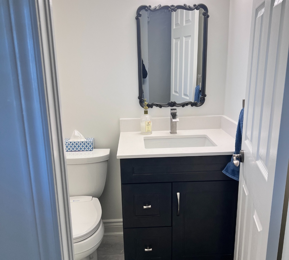 The powder room was refreshed with new fixtures, updated finishes and a cleaner, more contemporary look. We also rebuilt and refinished the staircase, creating a smooth transition between floors and enhancing the home’s overall aesthetic.