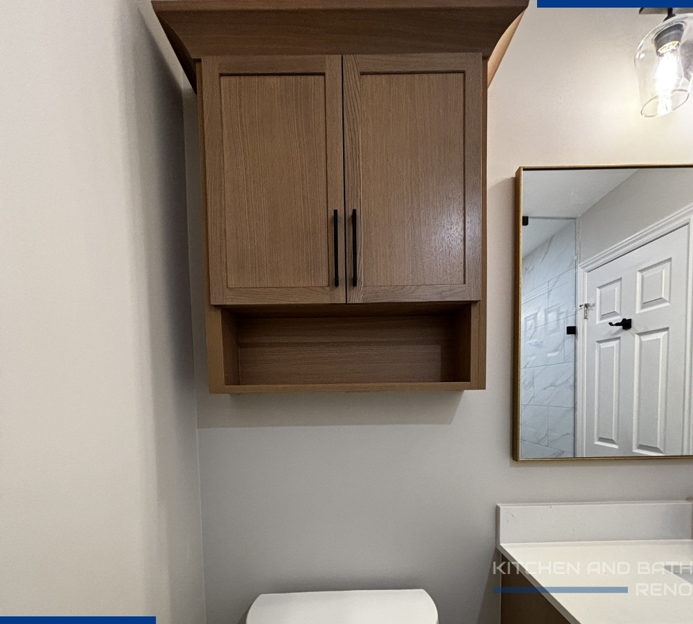 To maximize storage without crowding the room, we added a wall-mounted cabinet above the toilet, giving the homeowners practical storage while maintaining a streamlined look.