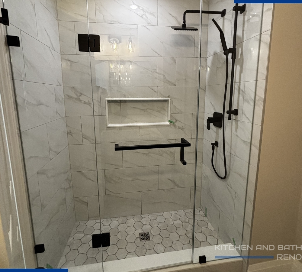 Work Completed: Full demolition, plumbing, electrical, tiling, custom vanity installation, lighting, glass shower enclosure, finishing